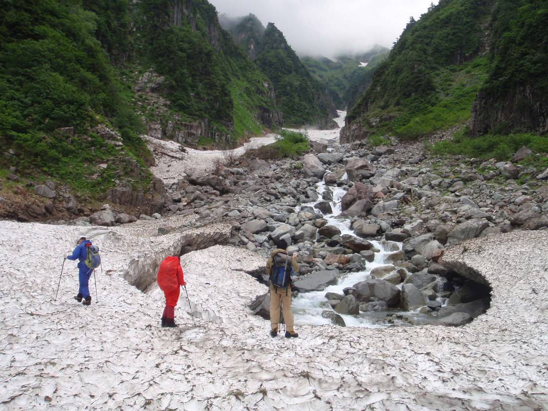 展望台を過ぎると慎重な雪渓歩きがはじまる、ここからは穴毛本谷のような巨大で安定した雪渓とは違うのだ。