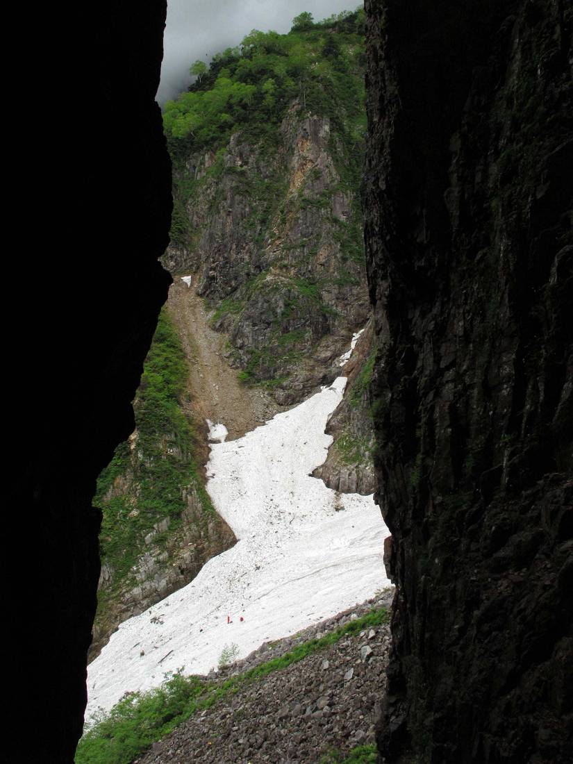 観音さまの中から・・・    雪渓上の二つの赤点は我らが姫君なり