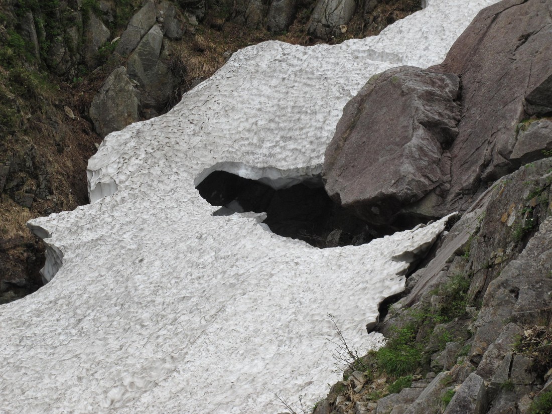 これには、ビックリ!。こういう光景にでくわすと、雪渓の怖さが身に沁みますね。用心用心。