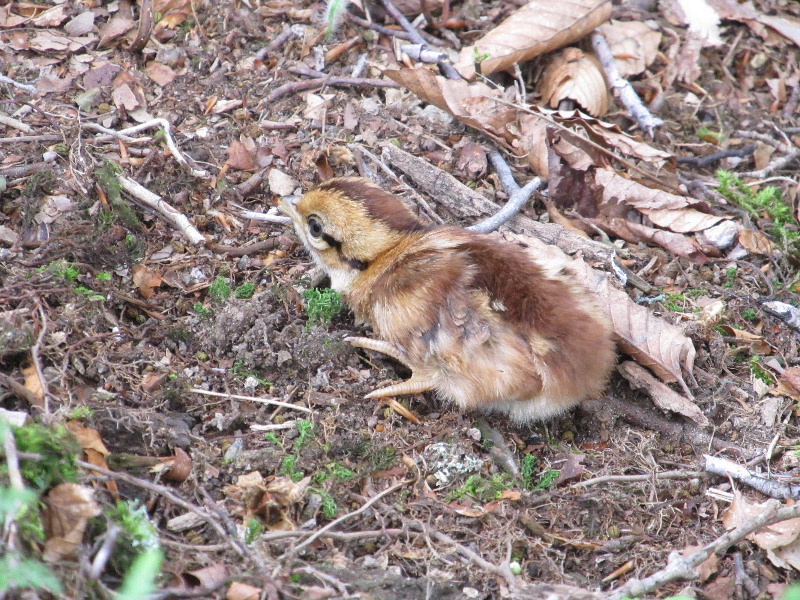 「騙そうたってダメだよ、タマゴでもあるんだろ」と居た所を見ると五羽程のヒナがいた、写真を撮ろうとカメラを構えると同時に4方に散って行ったが一匹だけじっとしているのでパチリ。それを見てか離れていた親鳥が這いながら戻ってきて残った雛を追い払う。今度は親鳥を写そうとするが上手く捉えられず失敗、少し離れて飛んでいった、逃げた雛はそれ程遠くには逃げてないのだが保護色で全く判らなくなった、親鳥の作戦にやられてしまったのだ。