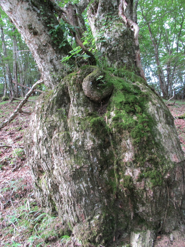 曇り空の割りに暑くて時々水で頭を冷やす、高度を上げると周りの木も太く成ってきて稜線が近い事を感じる、赤ゾレ池に出る水流の無い谷に入り左手の尾根に上がると太いミズナラが目立つ所、有ったあったまんじゅうミズナラ、でべその有るミズナラだ。