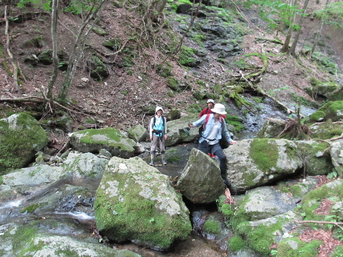 地蔵谷の頭から北の谷に下る、V字型の狭い谷、ボブスレーのコースの様に外れる事も無い一筋の谷を降りていく、長いなと思った頃十字峡に出た、十字峡の右叉の谷だった、ここは以前降りたことが有ったんだ、結局同じ谷にはいってしまってたんだ。 誰もいないだろうと思ったら人影、北尾根を降りてきたBさんグループだった。すでに3時前、先を急ぎ地蔵谷出合から林道に上がって車に着いたのは3時をまわっていた、まぁいい時間でした。津の山岳会の方達はすでに下山してきてました。