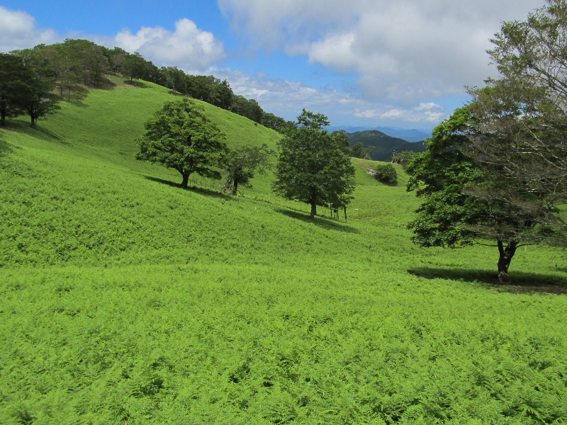 稜線近くでは凄いハエで、立ち止まるとわんさかまとわり付くが意外にブトが少ないのが幸いだ、とりあえず赤ゾレ池に向かう、赤ゾレ池はイワヒメワラビの鮮やかな緑に覆われてたたずんでいた、奈良県側の開けたところまで行くと大叉側はすっきりと遠くまで望めるのだ、今から向かう薊岳の斜面は大叉になだらかに落ちている。