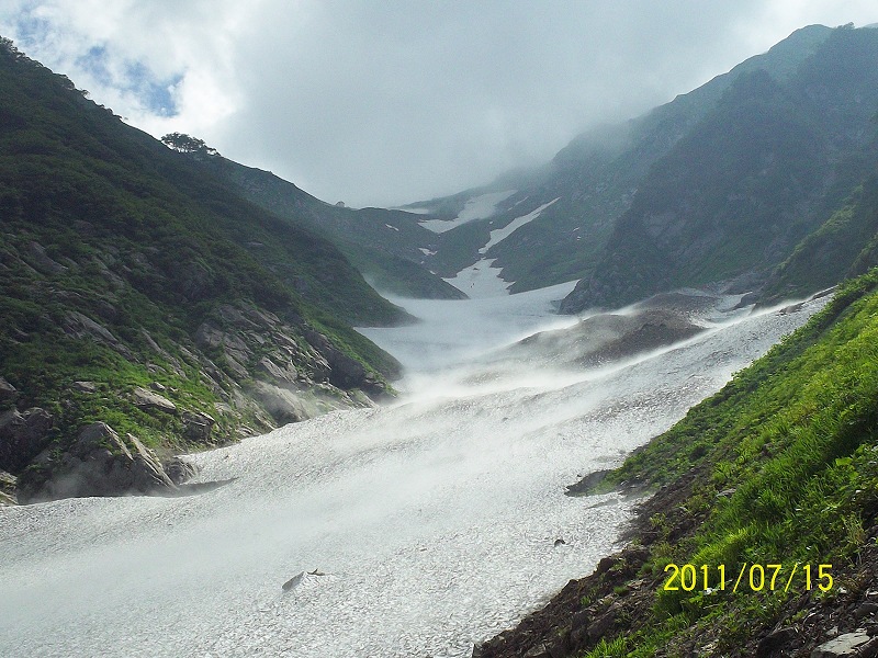 これには一瞬目の前が真っ暗、顔面真っ青でした。雪渓の奥深くへ流されて吸い込まれずに済んだのが不幸中の幸いでした。