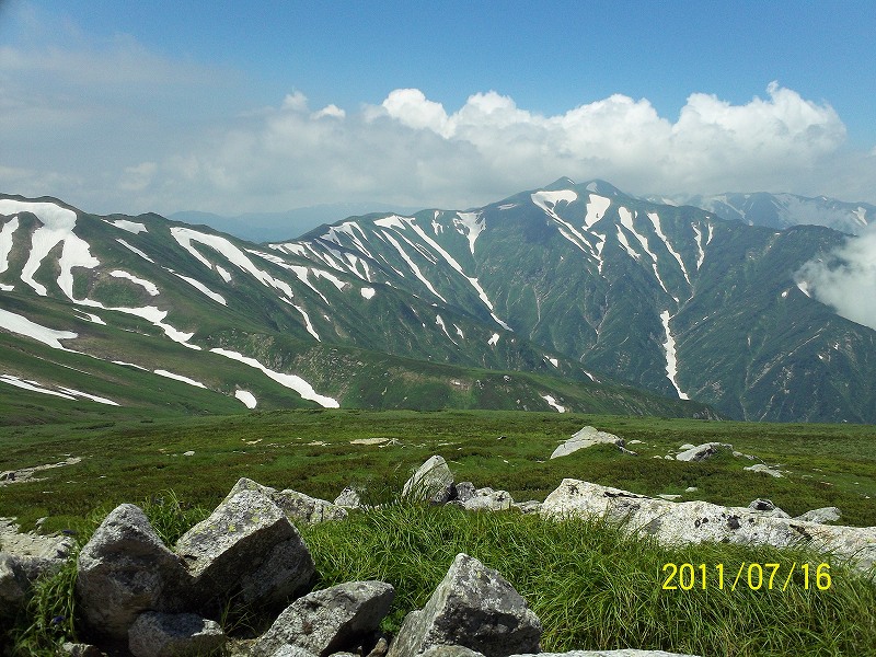 天狗岳を過ぎるころから天候が急に回復してきた。なんという変わりようだろう、太陽がガンガンに輝いてきた。御西小屋に着くと緑と残雪の輝く素晴らしい稜線一体が遠方まで見渡せるようになってきた。秋田の人と一緒に水場の上で休憩。ぼくとつながら好男性である。おいしい水をがぶ飲みだ。チングルマがきれいだ。大日岳の勇姿に今回登る計画をしていなかったことが心残りとなる。次回のお楽しみにとっておこう。