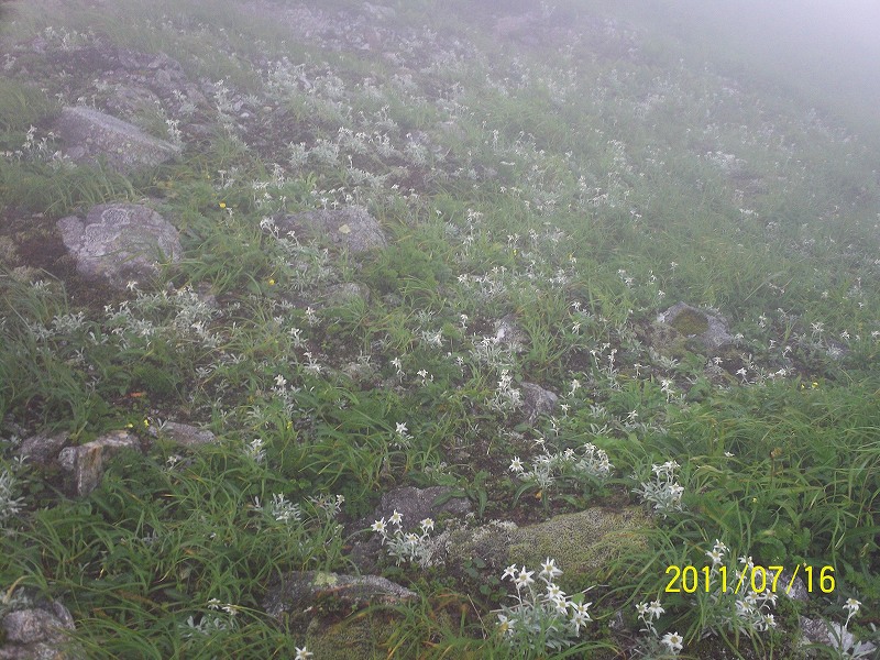 「この先の雪渓は危険で、過去に滑落死しているので赤旗に沿って上部を巻いていくように、お花畑よりも命が大事だから」と指示される。タイミングよく会えたものだ。先行した秋田の人はトラバースにかかり、アイゼンを装着したと聞いた。ガスで高度感がないので幸いしているのだろう。僕はといえば当然のごとく上部を巻いた。御西岳から北はまだまだ雪が多い。