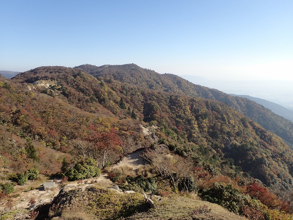 地形が現れるともう中峠である。そこで一面の紅葉が見られるかと期待したが色はいまいち。でも快晴で伊勢湾まで見通せる。