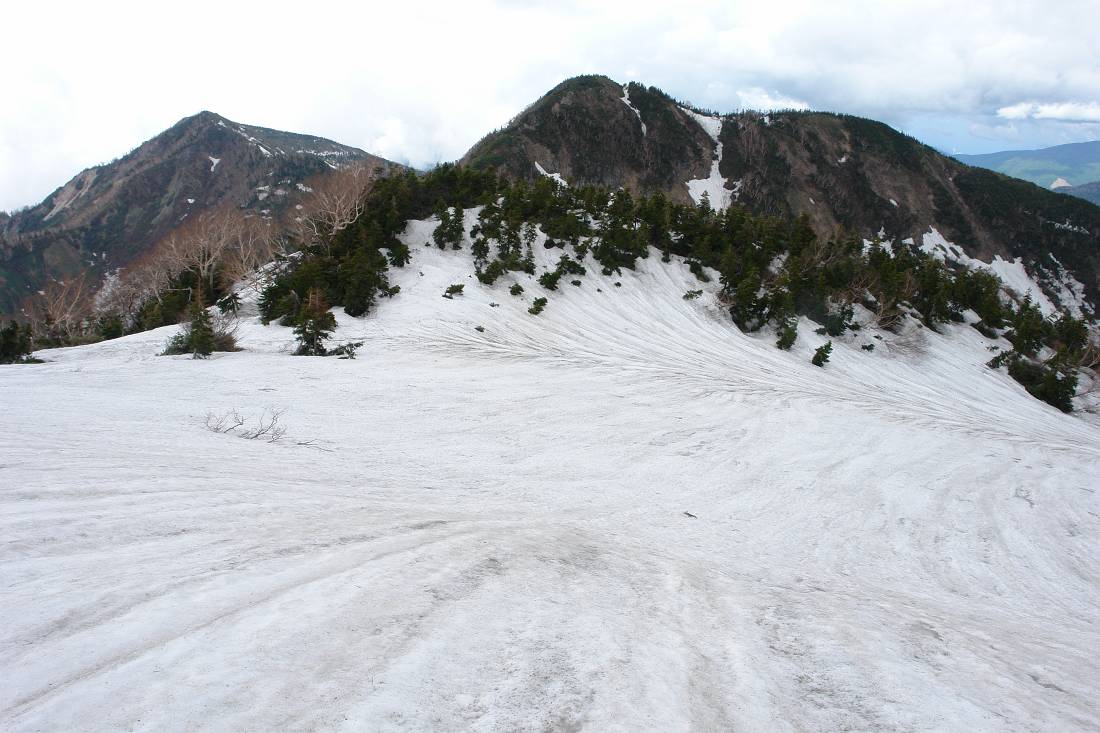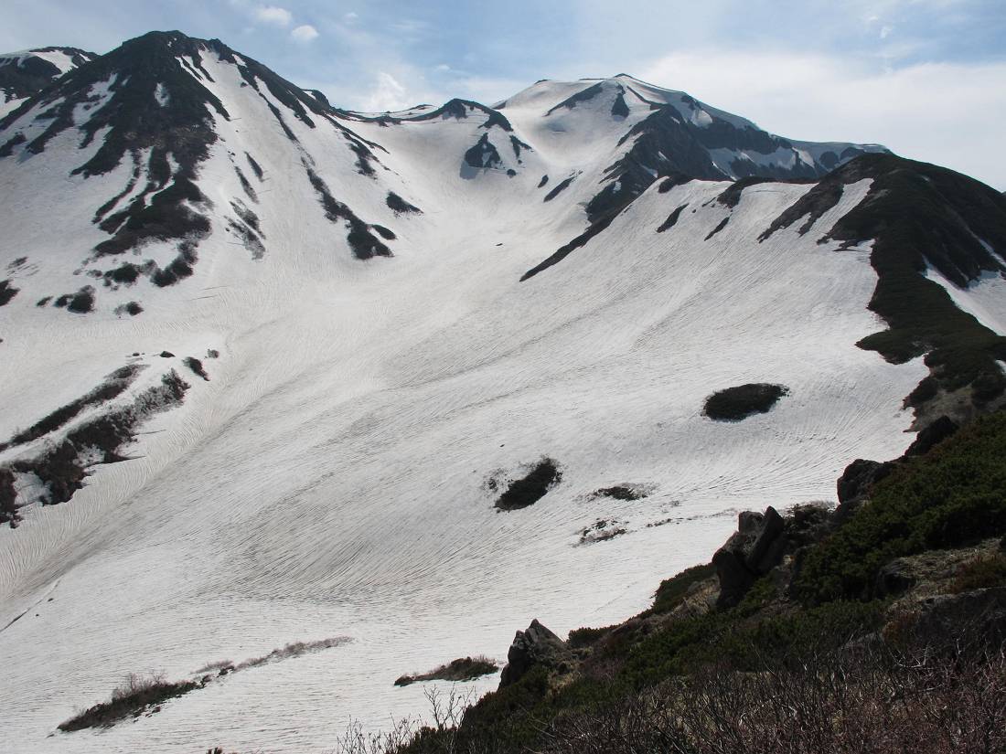 12時少し前に出発。岩場を下るとやがて雪渓に入る。これがヒルバオ雪渓か…。このまま稜線南側を下り「お花松原」あたりで稜線に戻る、というルートらしい。 雪渓は緩んではいるがアイゼンを忘れてきたので歩きにくい。ガスが濃くなったり晴れたり。晴れると全景が分かり見通しが効くのだが…。