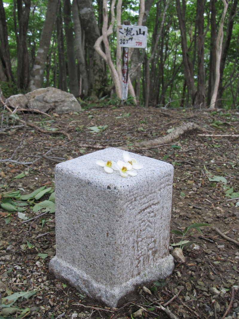 木梶南峰を通りツリ尾根に出て昼食、やはり虫の襲来が激しい、ネットを被ったままで中に手とパンを入れて食べる、あたりにはシャラかヒメシャラなのか見分けが付かないが沢山花を付けている、白い穂状の花はリョウブだろう良い香りを漂わせている、これで虫がいなければ最高なんだけど、それでもいつもよりゆっくり休んで、もう時間も無いのでここからゼイノ谷に下る、こちらにもシャラの落花が沢山ここの花はでかいな、椿並みの大きさだよ。植林自然林堺を降りて谷に降り立った。対岸の尾根はヤシオ尾根からの迷い易い尾根なんだ、ぐ~さん一度降りていたよな、あの頃は未だ山に入ってそんなに経っていない時だった、ヤシオ尾根下るのも躊躇いていた頃が懐かしいな。
