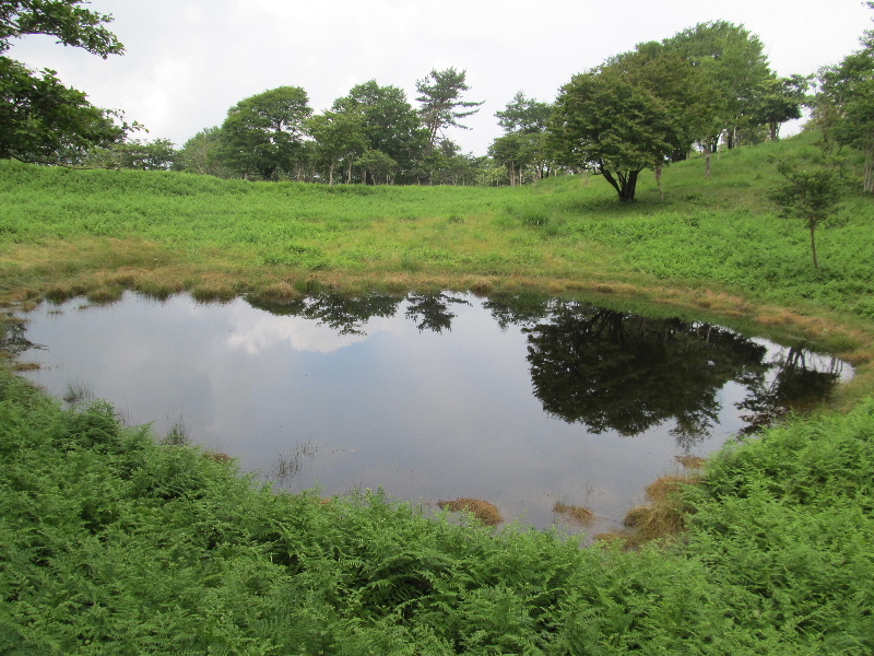 赤ゾレ山の山頂に到着、誰もいない、空はどんよりガスっぽい。ザックをデポして下に降りてみる先週見つけたお頭付きはそのままだ、山頂のオブジェにしょうと手に持って赤ゾレ池の撮影、今日は池に景色が映ってきれいだな。山頂に戻り鹿のお頭を木に付けた。虫が多いので今日は頭から被るネットも持って来た、フードと二重に被ると効果は有る様だ。