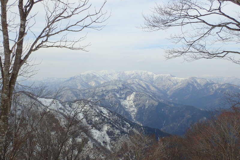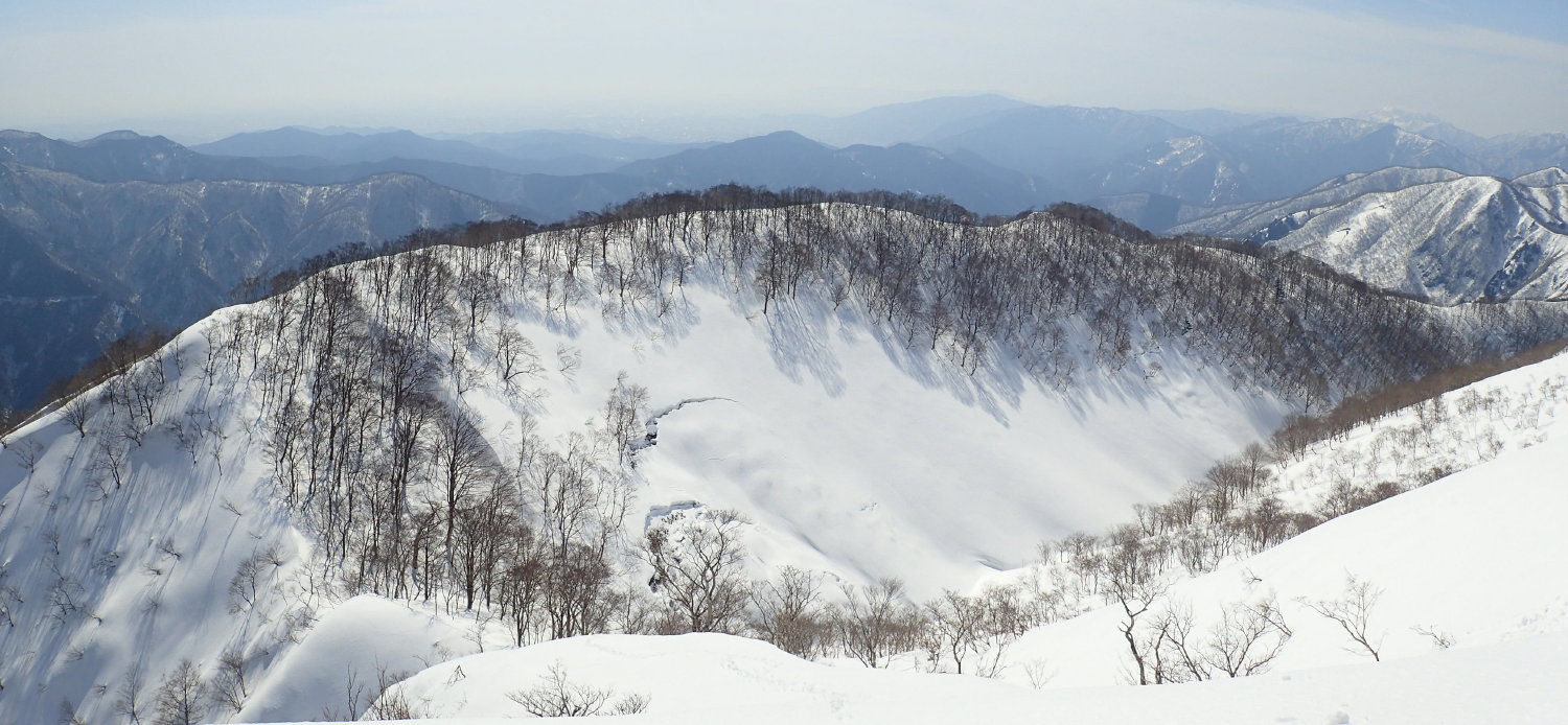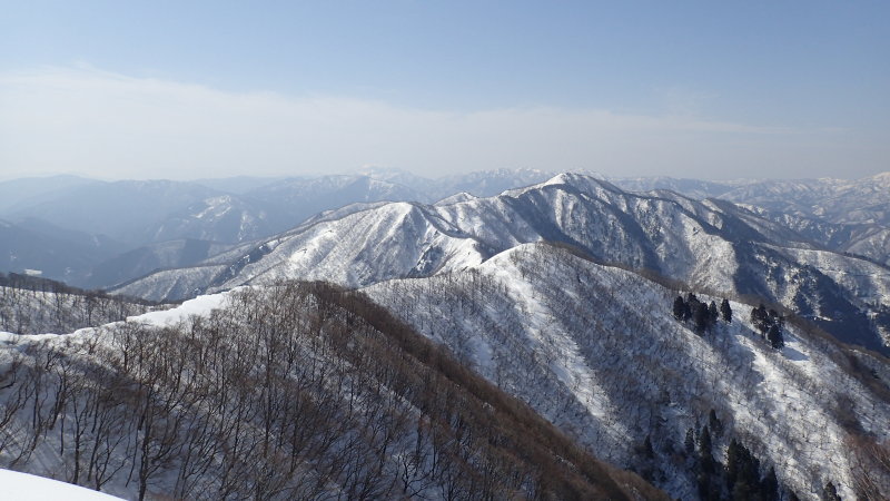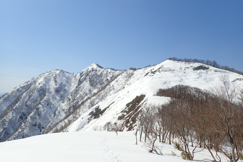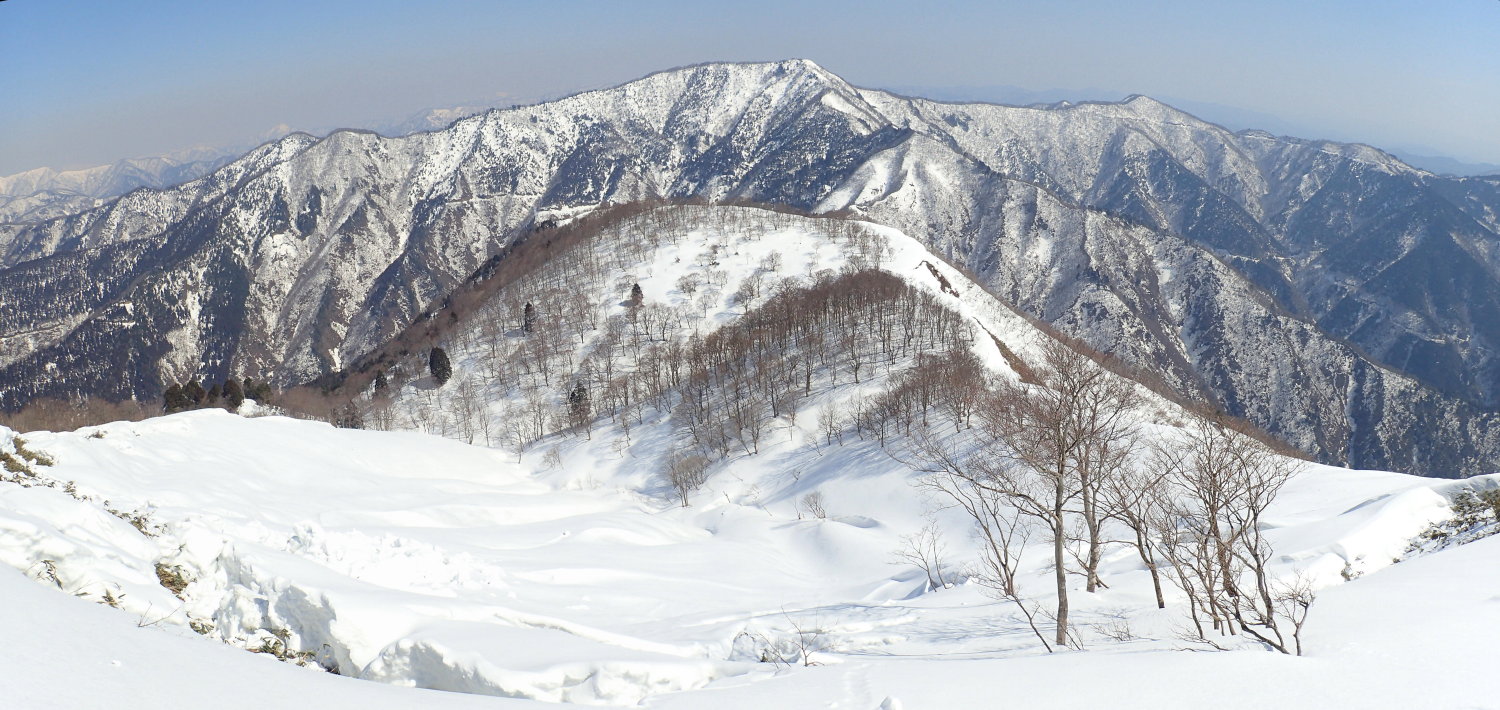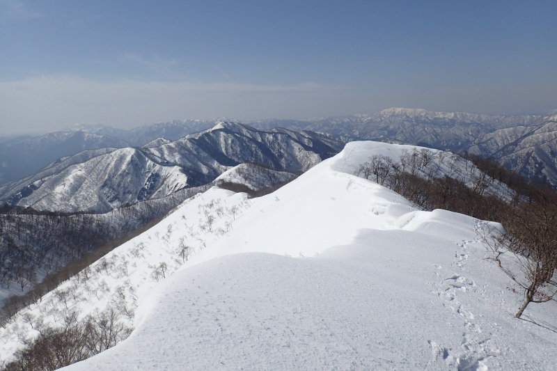 ここから南へは小津権現、北へは雷倉へと雪稜が長く尾を引く。