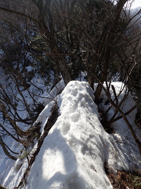 しかし本当の核心部はこの先にあった。西側斜面から植林が迫ったヤセ尾根は不安定な雪が乗り、半ヤブ漕ぎしながら右側に転落しな