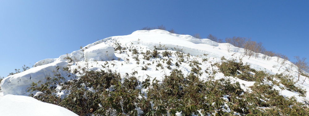斜面はササが露出しているところもあり、落ちた雪庇の巨大なブロックが転がっている。