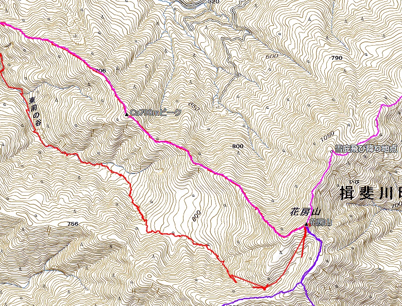 藤橋5:00~花房8:15=8:45再スタート~雷倉12:45=13:10再スタート~尾根下りスタート13:30~林道16:30~林道歩き~藤橋17:50 13時間ほどの長旅でしたね。雷倉から尾蔵谷林道への尾根下りが迷い易く問題ですね、往生しました。