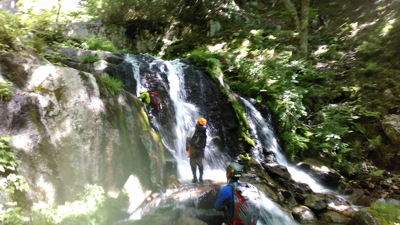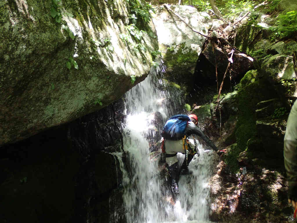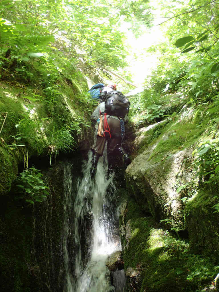お助け紐を下げて、引き上げてもらう。次の滝約6mは巻き、約3m凹角の滝をステミングで取り付くがあと少しで落ち、空身で再トライ。なんとか