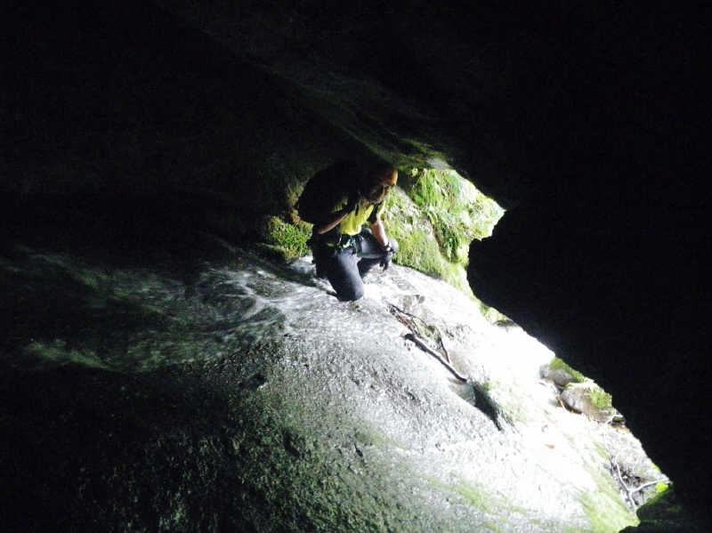 樋状滝(50m)現る。奥に入ると身動きが取れなくなるので、ここもステミングで登るが、ぬめってきわどい。お助け紐を出して登ってもらう。