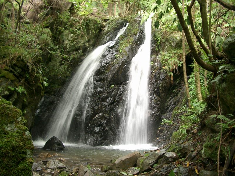 美しい二条の滝は荒れた道筋のなかのオアシスですね。