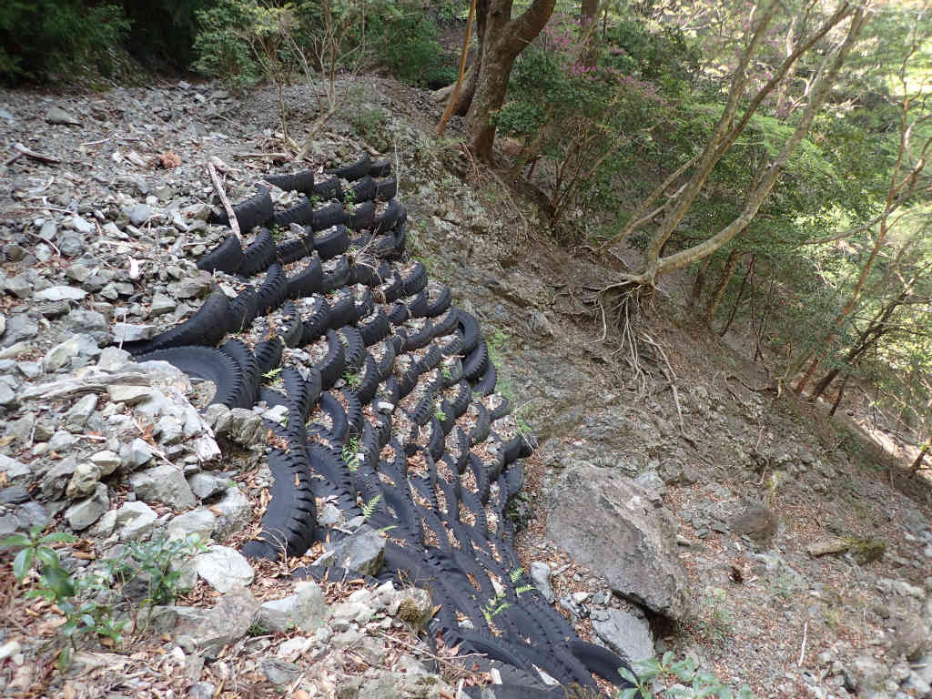 廃林道を歩いているとあちこちに崩れた廃タイヤ製の堰堤があった。
