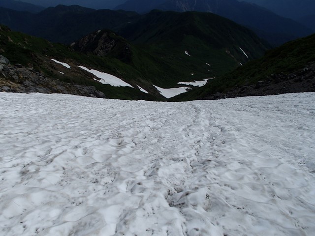 大汝鞍部への登り返しは当初登山道のつもりだったが、ひんやり涼しい風の誘惑にそのまま雪面を登ることにする。