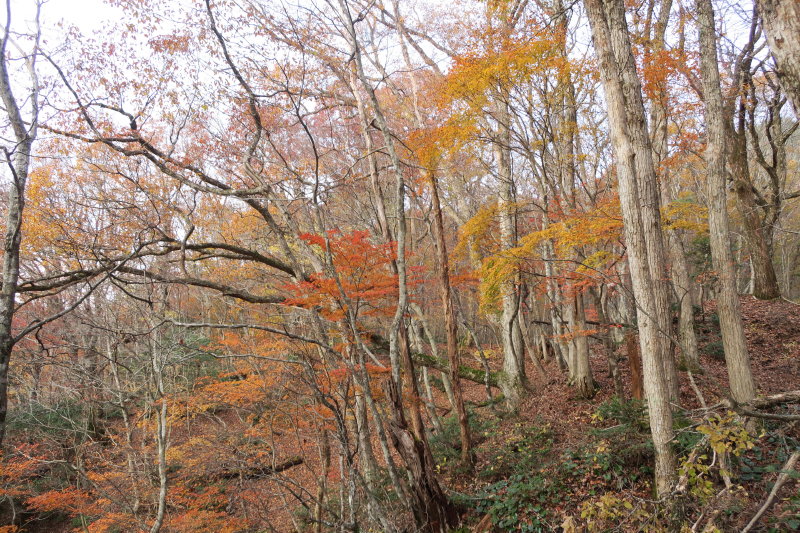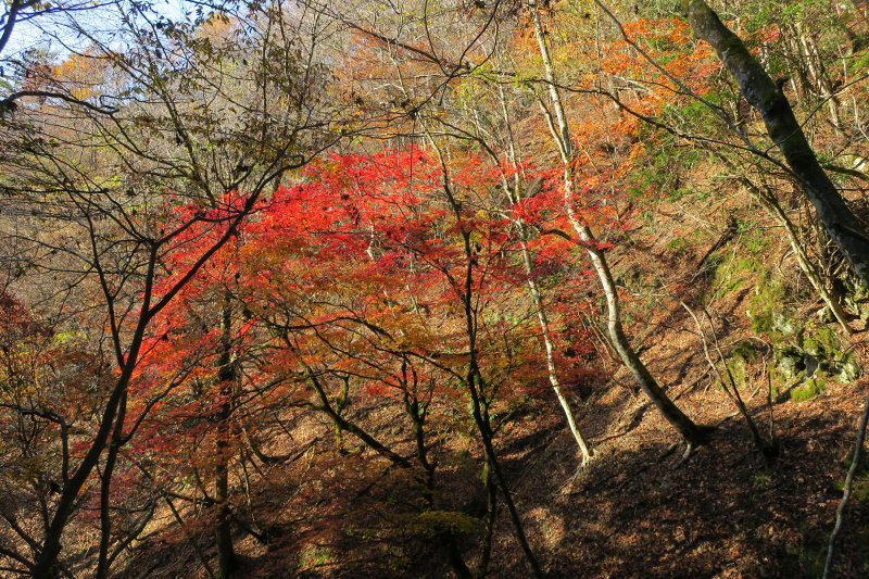 がウソのようだ。500m以下の標高の場所は紅葉もまだ見頃で、山の斜面を彩る赤と黄のタペストリーが美しい。