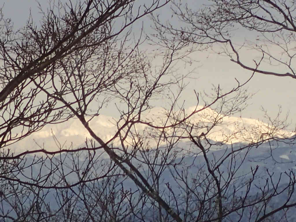 標高はわからないが雪がつながったところでスノーシュー装着指令が出る。スノーシューの分だけ荷重が減って楽になる。627標高点まで来るとあとは稜線漫歩である。次第にブナが増えてくる。この辺りの山の魅力は美しいブナ林にあるらしい。北方には白山がきれいに見えている。ぐーさんがブナ林は藪が少ないという持論を展開している。 「植物の生産する物質が他の個体あるいは他の生物に及ぼす作用」を他感作用(アレロパシー)と呼ぶが,ぐーさんの議論は一言で言うと,ブナがアレロパシーを持っているかどうかということである。今の所,ブナがアレロパシーを持っているという証拠はないが,他のブナ科植物でアレロパシーを持っているものもあるので,ブナにアレロパシーがあってもおかしくなないだろう。ぐーさんが言うようにそれが発見されれば新発見になるかもしれない。 それはさておき,この尾根は真っ直ぐでなく複雑に折れ曲がっているので,天気が良ければブナ林を楽しみながらの楽しい稜線漫歩になることだろう。残念なことに,天気は下り坂で徐々に風が強まっている。右手には今庄365スキー場が見え,その向こう,山を越えたところに敦賀湾,さらにその向こうに西方が岳が見えている。 739標高点からしばらくで江越国境稜線に出る。余呉スキー場がすぐ近くである。ここには栃ノ木峠から林道が上がってきているようだ。稜線をしばらく東進し,送電線鉄塔のあるピークで昼食とする。のっぺりしたピーク上にあるにもかかわらず風が入り込まないので,絶好の昼食場所である。あっという間に16人分の昼食テーブルが用意され,お待ちかねのランチタイムとなる。今日はkitayama-walkさんの誕生日だそうで,びわ爺がワインのボトルを担ぎ上げてきた。みんなでお誕生日の乾杯をする。 昼食後は目的地の音波山に向かって稜線散歩。藪が少しうるさいが,まあまあいいハイキングである。千手観音のような大ブナのすぐ上が音波山だった。山名板は雪の下なのか見当たらない。ずうっと遠くに上谷山ののっぺりしたピークが見える。あんなところまで1日で歩けるんだろうか。 もう時間も遅いので,稜線を西にco820mまで戻り,真っ直ぐに北に向かって下りている稜線を下山する。雨が降り出している。雪が少なくて藪がうるさいが,降りられないことはない。最後の急斜面でスノーシューを脱ぎ,チェーンスパイクに履き替える。前回の森山岳の下山のように長い急降下が続くかと思ったが,意外にすぐに下についた。最後の渡渉がアトラクションなのかと思ったが,すんなりと渡渉することができ拍子抜けだった。といっても,流れにハマった人もいたようだが。
