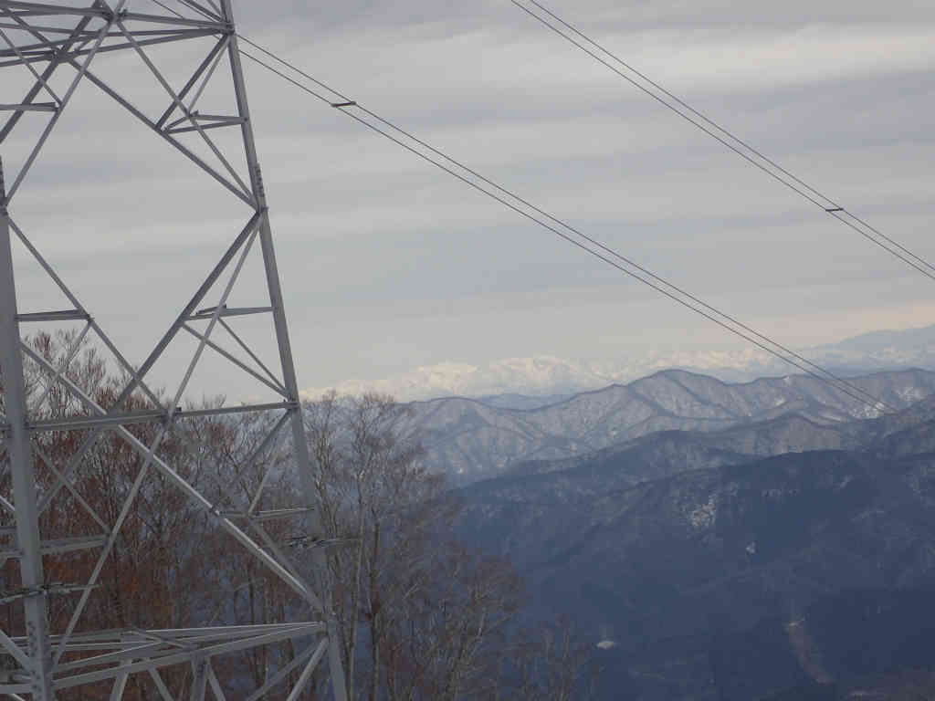 稜線をしばらく東進し,送電線鉄塔のあるピークで昼食とする。のっぺりしたピーク上にあるにもかかわらず風が入り込まないので,絶好の昼食場所である。