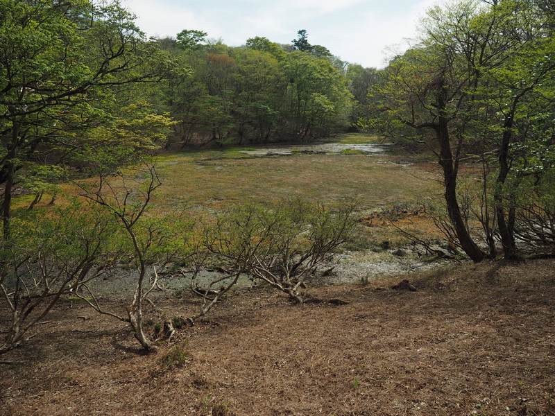 しかし、長池を取り巻く斜面の上か池を俯瞰して驚いた。池の南半分が干上がっているのだ。昨年も4月と6月にこの長池を訪れているが、いずれの時期にも水を湛えているのだった。今年の冬の降雪量が少なかったからだろうか。