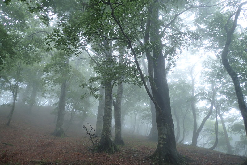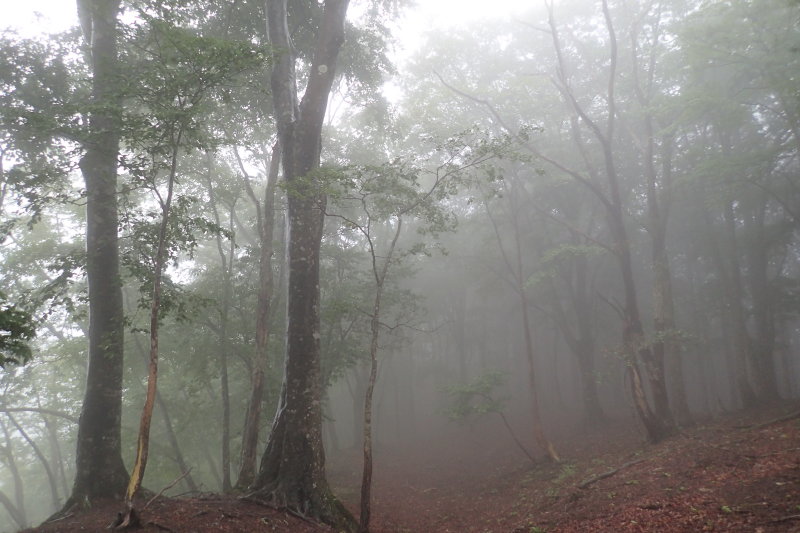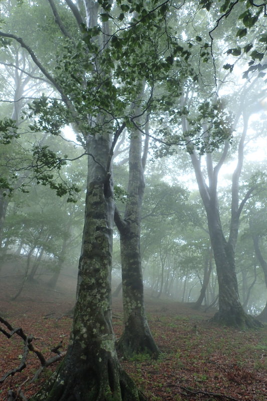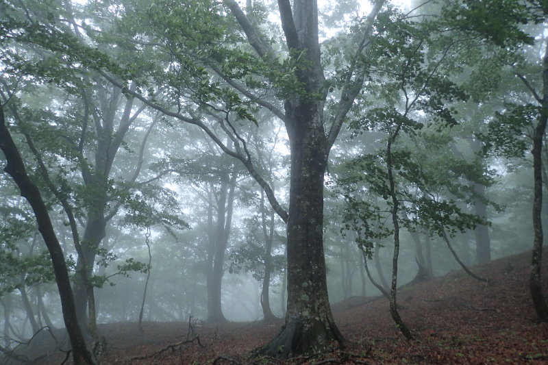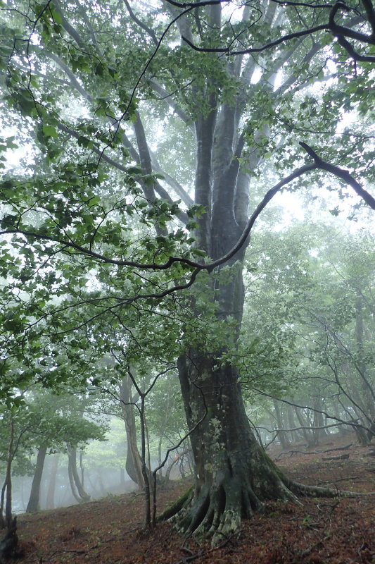 P918mに立つ大木(ハリマオさんによるとお母さんブナ)やブナ権現と呼ばれる小台地に広がるブナ林は霧に煙っ