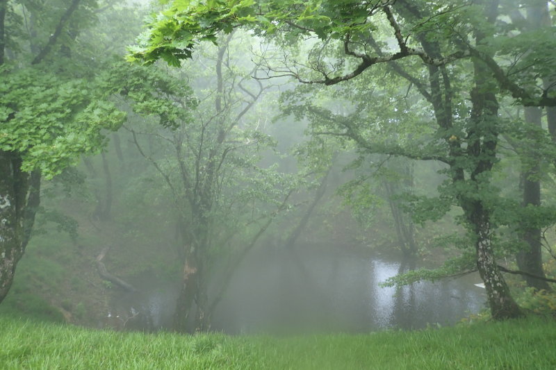 と湛えて池らしい風情を醸し出している。霧の中から浮かび上がる丸い水面はまさに幽玄の世界だ。