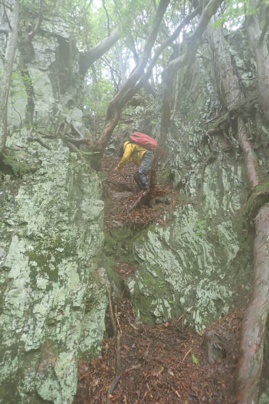 尾根の末端では再び急傾斜となり、岩壁の間にここを通れとばかりに開けられた急峻なルンゼ状を慎重に下っ