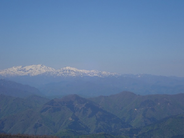 前山につくと展望が本格的に開ける。高木も無くなり、登山道のササも刈り払われている。雪も出てきた。じき山頂へ。まずは白山がおいでおいでしている。