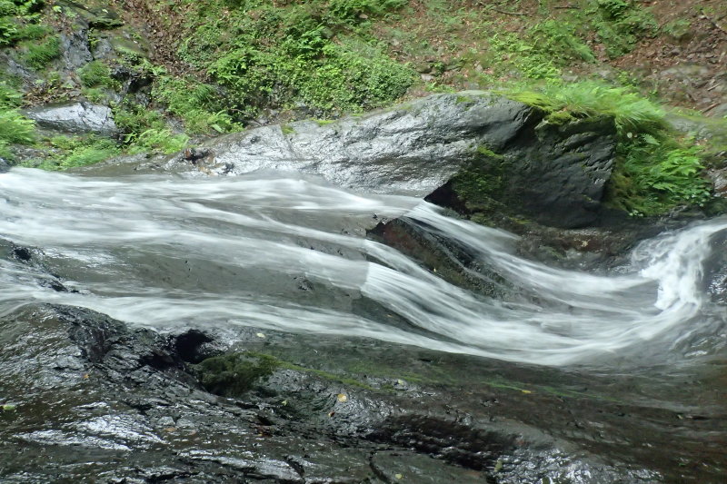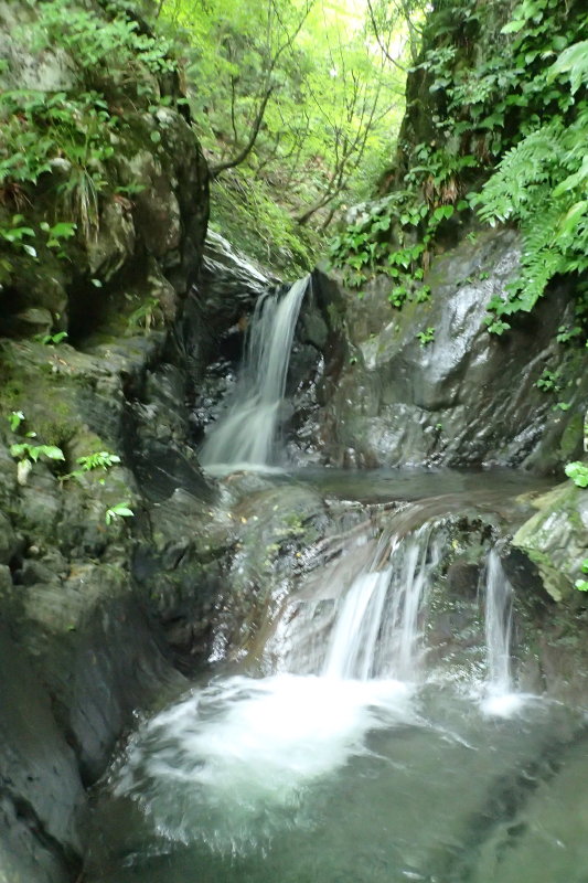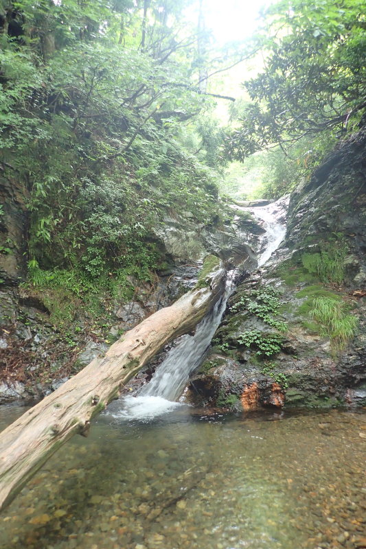 すると意外に早く植林が終わり、自然林が谷を覆ういい雰囲気に変わってきた。これは予想外の展開である。やがて川床が岩盤に変わってナメが走り始めた。小さな滝も現れ、両岸が立ったゴルジュの様相を呈し始めた。