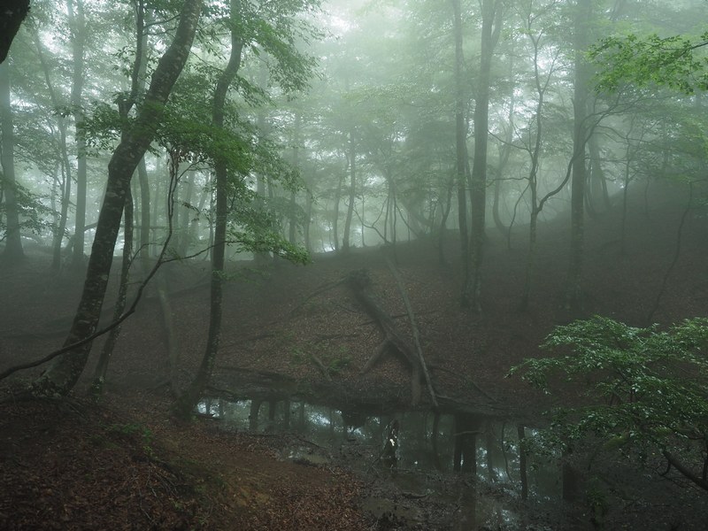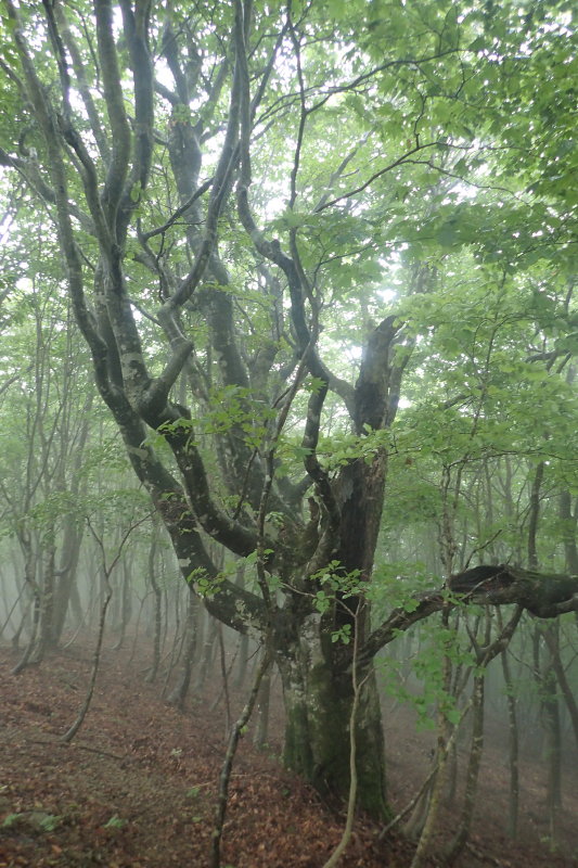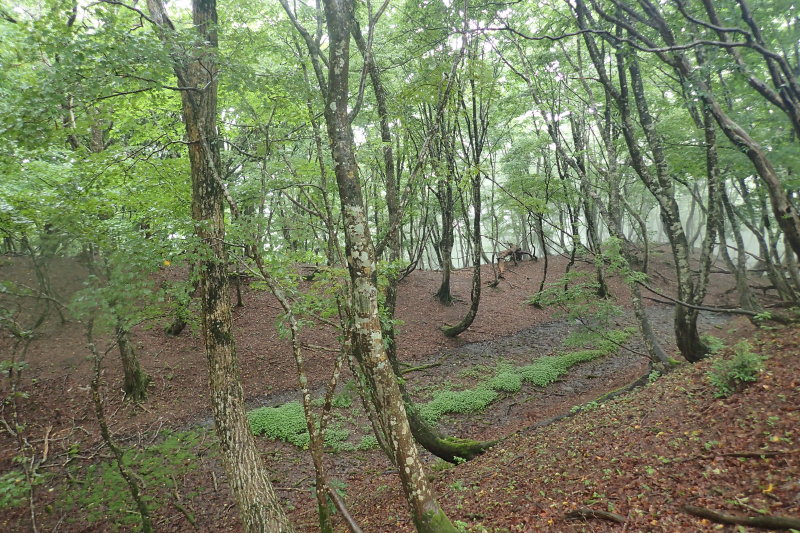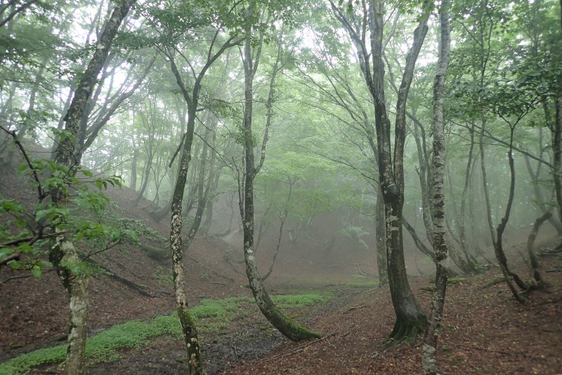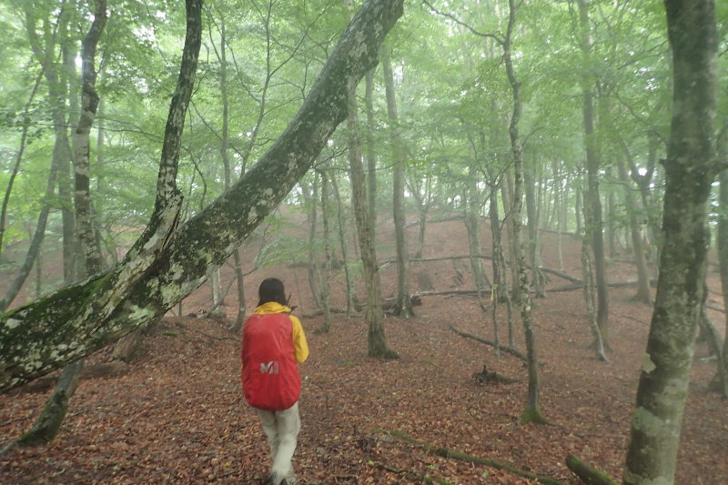 しまった霧に烟るブナ林は味わい深く、晴れているより美しく感じる。雨が降っていなければもっといいのだが。