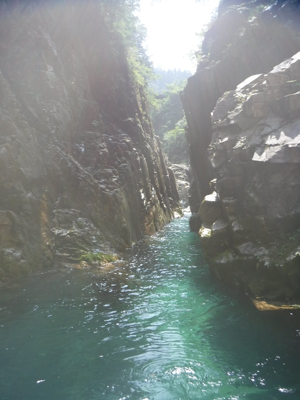 ゴルジュに入ると谷は立ってきて本流だけに水量も多い。いくつも瀞が出てきて泳ぐ。吊橋の残骸を越えると西ケ洞谷の出合で、このあたりまでは釣り師の物と思われるロープなどがある。電力会社の点検用の吊橋を越えると50m瀞に100m瀞が続く。元越谷を大仕立てにしたような谷で水はエメラルドグリーンで美しい。青空の光が谷を照らし特別な美しさがあった。5回目のIさんはこんな条件のいい日は初めてと言っていた。