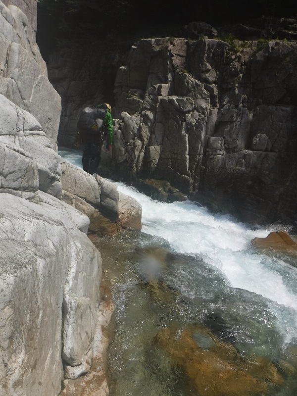 両岸が切り立った岩がにはさまれた谷はさらに狭まり激流となって川は流れていく。岩の要塞で5m滝と2m滝があるがいずれも瀑流で滝壺に巻き込まれたら大変だ。渡渉する場所が二ヶ所あるが、狙うルートがわかっていないと苦労するだろう。渡渉で流されると大変なので、ロープを出す。渡渉後は岩を登るのでここを越えた所で解除した。