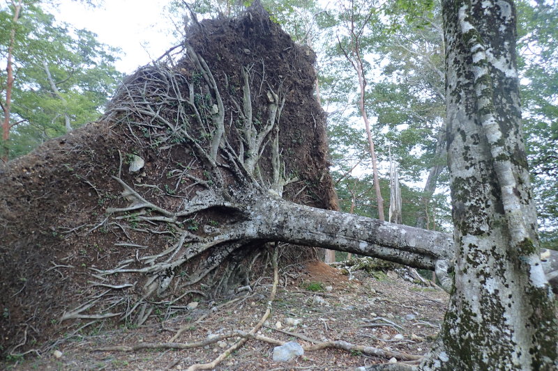 お気に入りの尾根なのだが、やはり倒木が目立って痛々しい。大きなブナが根こそぎ倒れて無残な姿を晒してい