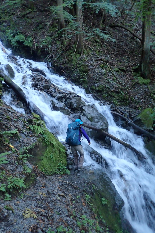 ここまで右岸から流れ込む小谷にも見慣れない滝がかかっていた。下山時に右岸をトラバースする山道を歩く