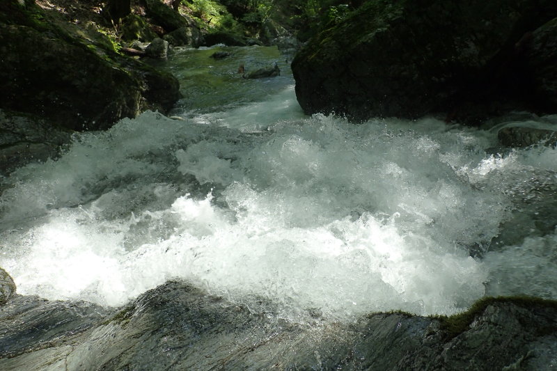 落口の上は快適なナメ滝が続くのだが、今日はとんでもない奔流が荒れ狂ったように走っている。