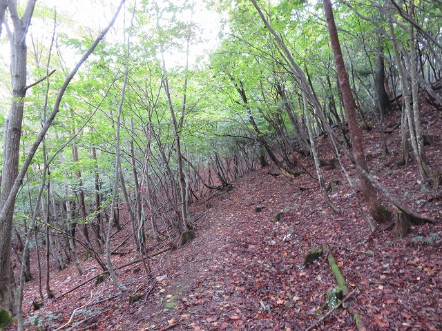 見えましたが、すぐに右股の右岸をトラバース気味に登って行きます。やがて水流も無くなり、この谷の源頭の急な坂をジグザグに登って行き、