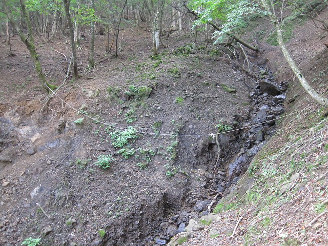 そして長命水とカタクリ峠(六合目)の間では小さい谷が10m程崖崩れ、崩れた場所は足掛かりがなく右岸を迂回。
