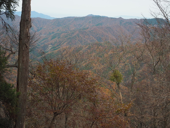 尾根から左手の谷を見ると広い谷はは褐色のカーペットの中を蛇行して流れる平流と鮮やかな紅葉の樹々が目に入る。右手に目を向けると久田川の流域に錦繍綾羅の山肌が裾野に至るまで広がっている。