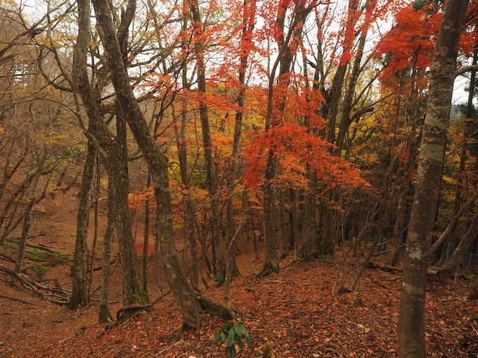 そこからは一転、それまでの藪が嘘のような下生のない山毛欅の快適な樹林となる。いよいよ権蔵坂に差し掛かると樹林の中には燃えるような楓の紅葉が広がっている。太陽はすっかり雲の中に消えてしまい、紅葉の透過光の輝きはないが、却って紅葉の色が落ち着いた深みを見せてくれる。いつの間にか風もなくなり、肌寒さは感じられない。