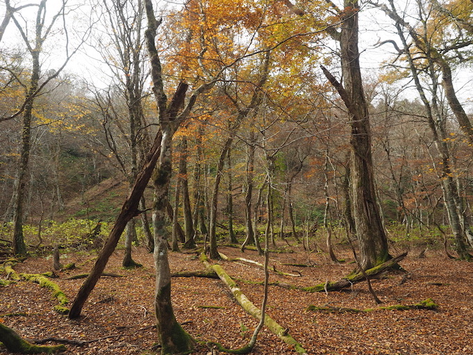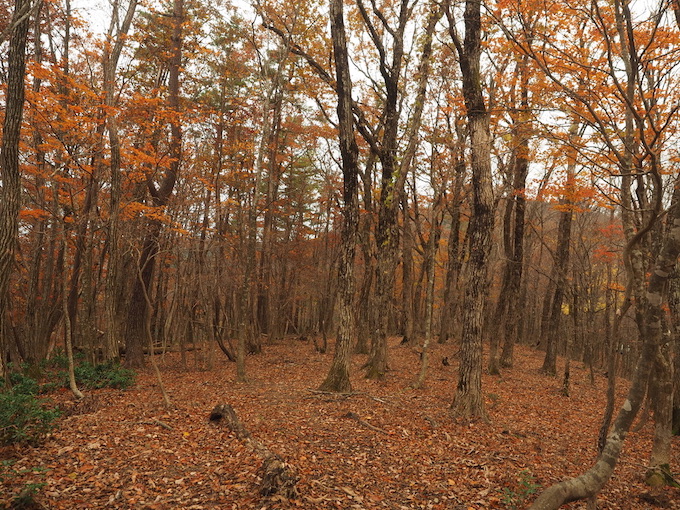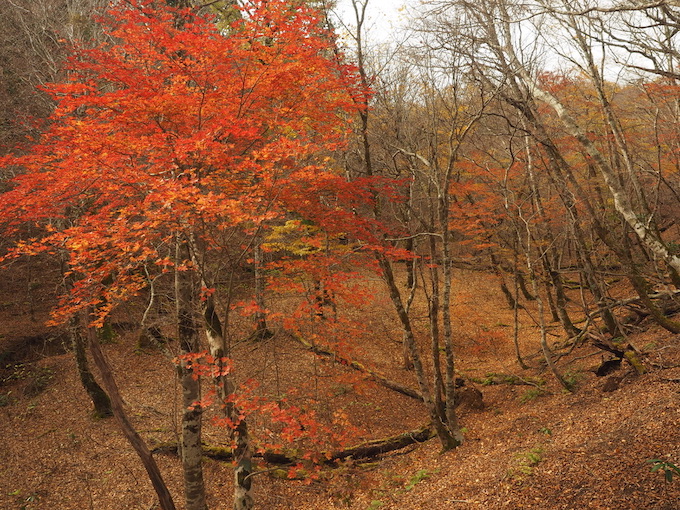 広くなだらかな尾根には山毛欅の間にはミズナラの紅葉が広がる。既に落葉してしまった樹も多いが、以前、五波峠から眺めた東側の尾根の雰囲気そのままであった。尾根を南側の斜面に寄ってみると斜面にはさらに見事な錦繍の樹林が広がっているのだった。錦繍の美しさに魅了されるがままになだらかな尾根を歩くと、五波峠にたどり着いてしまうのが勿体ないような気がするのであった。