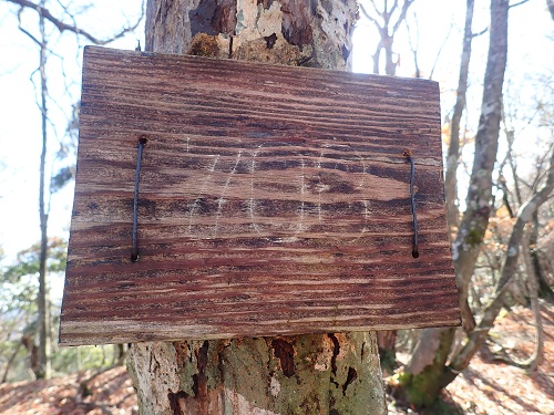芦生から登ってくる古道の雰囲気を写真に撮るうちに、峠の傍の細い樹に真新しい木製のプレートがあることに気がついた。この数ヶ月以内のものであろう。この真新しいプレートはここから先は踏み跡が続いていることを示しているような気がして、根拠のない安心感をもたらす。