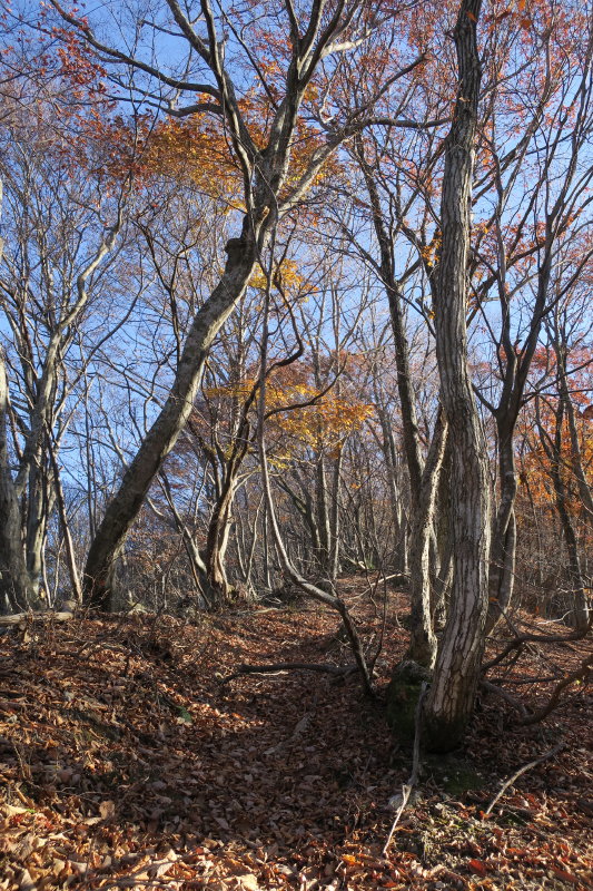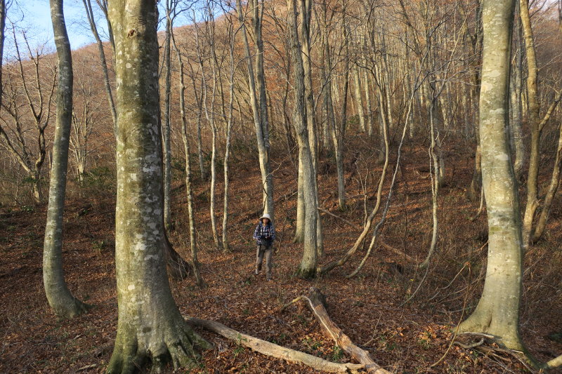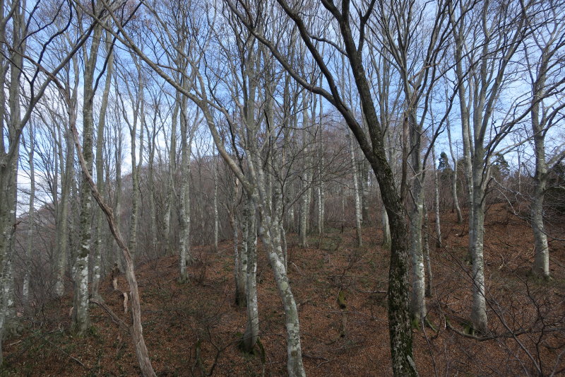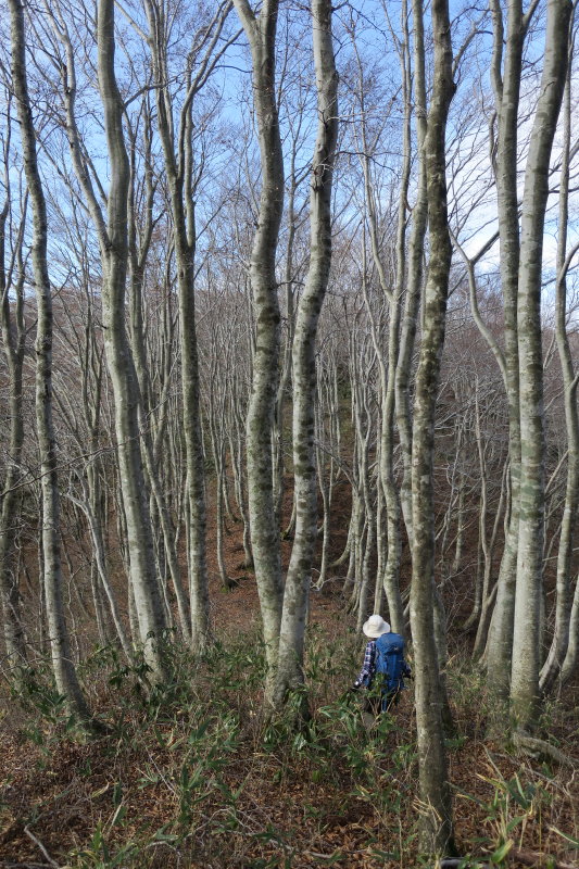 ヤブを突っ切って再びブナ林に入る。このあたりは尾根芯は杉の植林が入っており、尾根の西側斜面を拾って