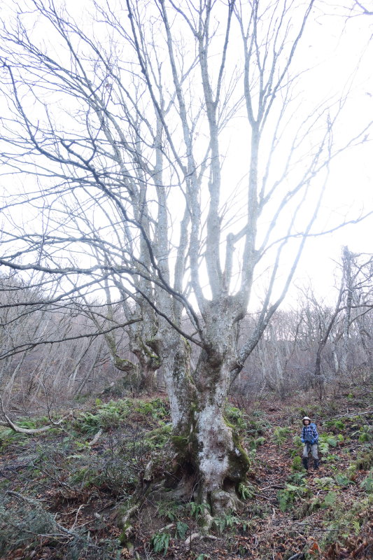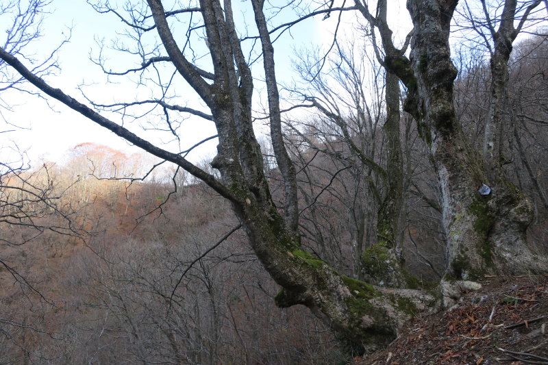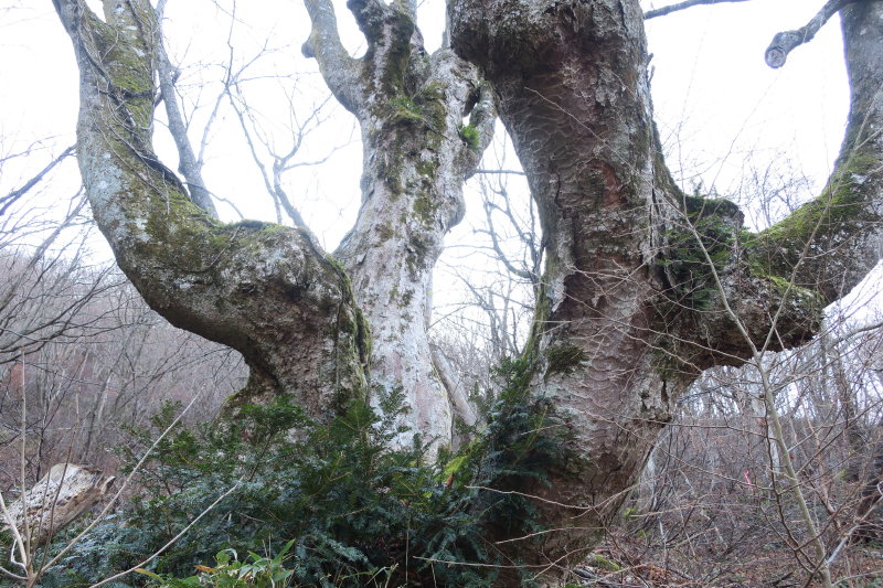 尾根上に唐突に3本のブナの巨木が現れた。すべすべの木肌ですっくと立つ美人ブナではなく、筋骨隆々とし