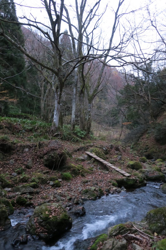 林道手前で谷を渡るところに木橋が見えた。