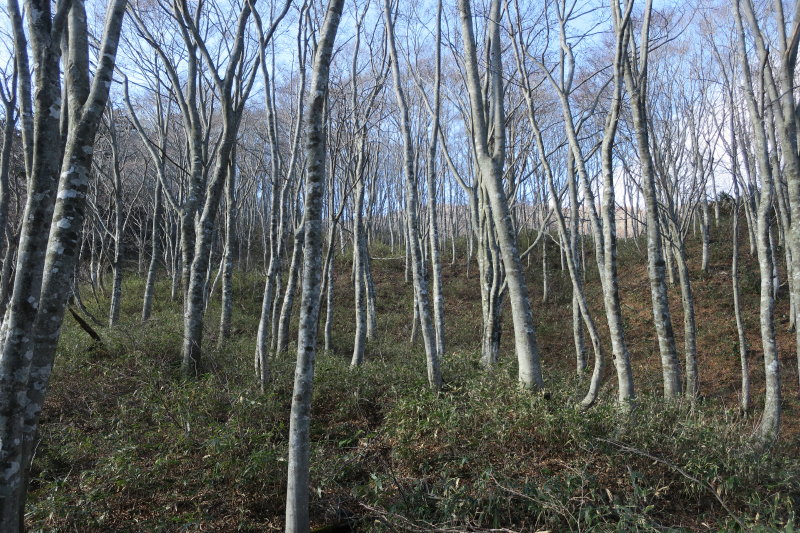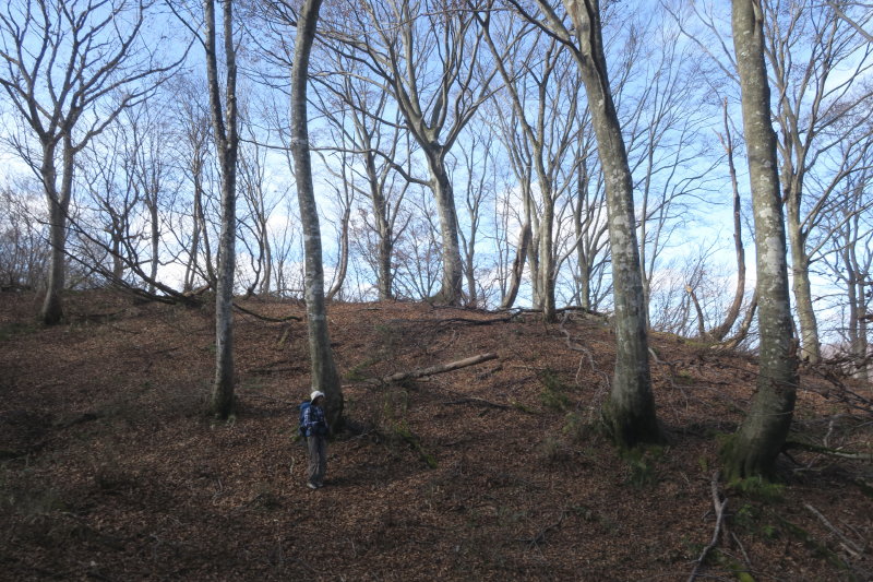 猫ヶ洞山頂手前のブナのコバは、積雪期に2度ランチを楽しんだ場所。雪がないとずいぶん平凡なところに見えた。
