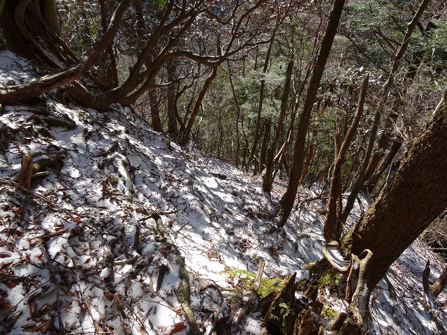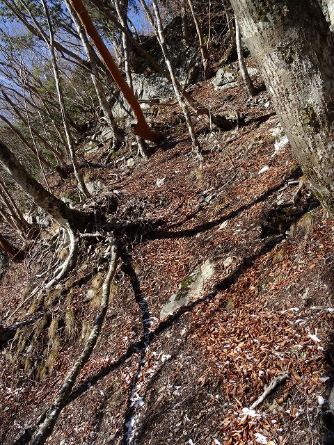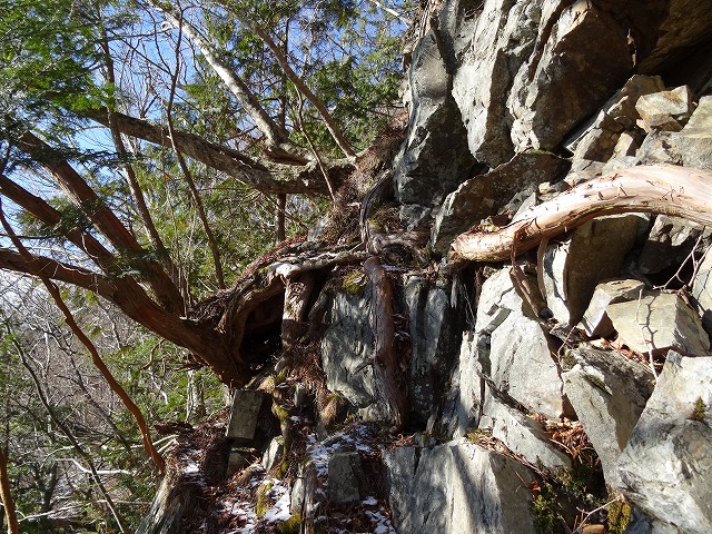 ここからさらに上の尾根端に登りつくまでが大変でした。急な斜面で手がかりになる木が少ないし、手がかり足がかりになる