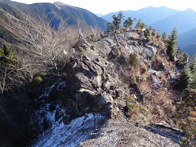 やがて焼け尾根の崩壊地にきます。思ったより長く続き、そんなに危険というほどではないですが、薄く雪が積もり